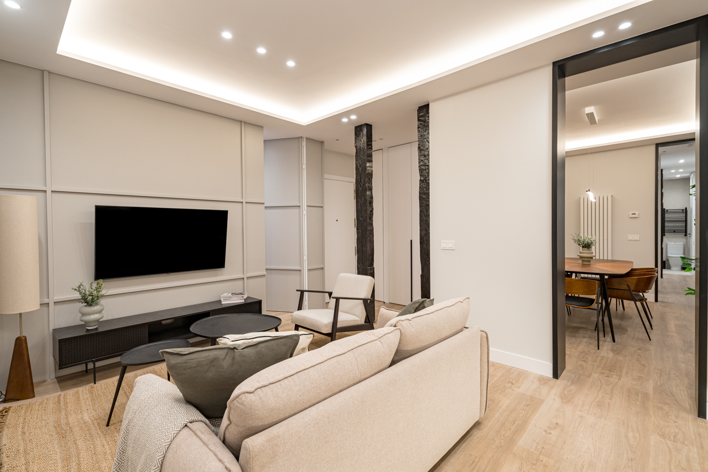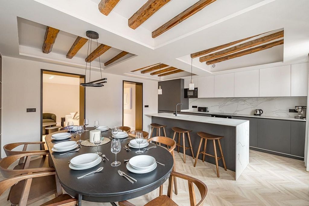 Explora la elegancia contemporánea en este piso reformado en el corazón de Madrid, en Jesús del Valle. Con paneles de madera, puertas ocultas y una cuidadosa exposición de la estructura de madera tradicional en tonos oscuros, este espacio fusiona lo moderno con la esencia histórica de la arquitectura.